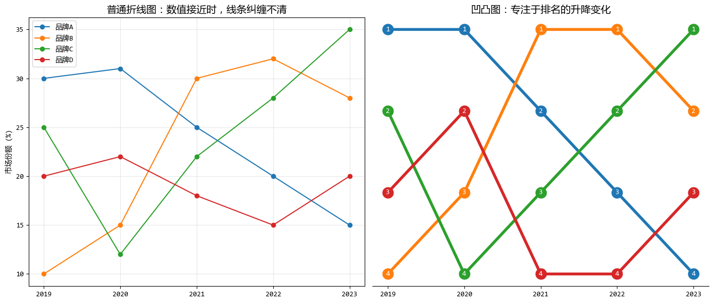 - 右图(凹凸): Y轴不再是数值,而是“名次”。这里将排名匀称拉开,你可以清晰地看到品牌C是怎样像黑马一样从末了一名杀到第一名的。