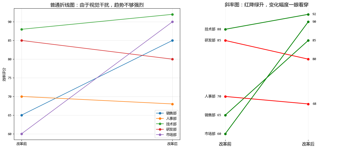 - 右图(斜率): 去掉了多余的刻度线,只生存首尾。线条越陡峭,代表变革越剧烈。这就像是从“阅读分析书”变成了“看红绿灯”,一清二楚。