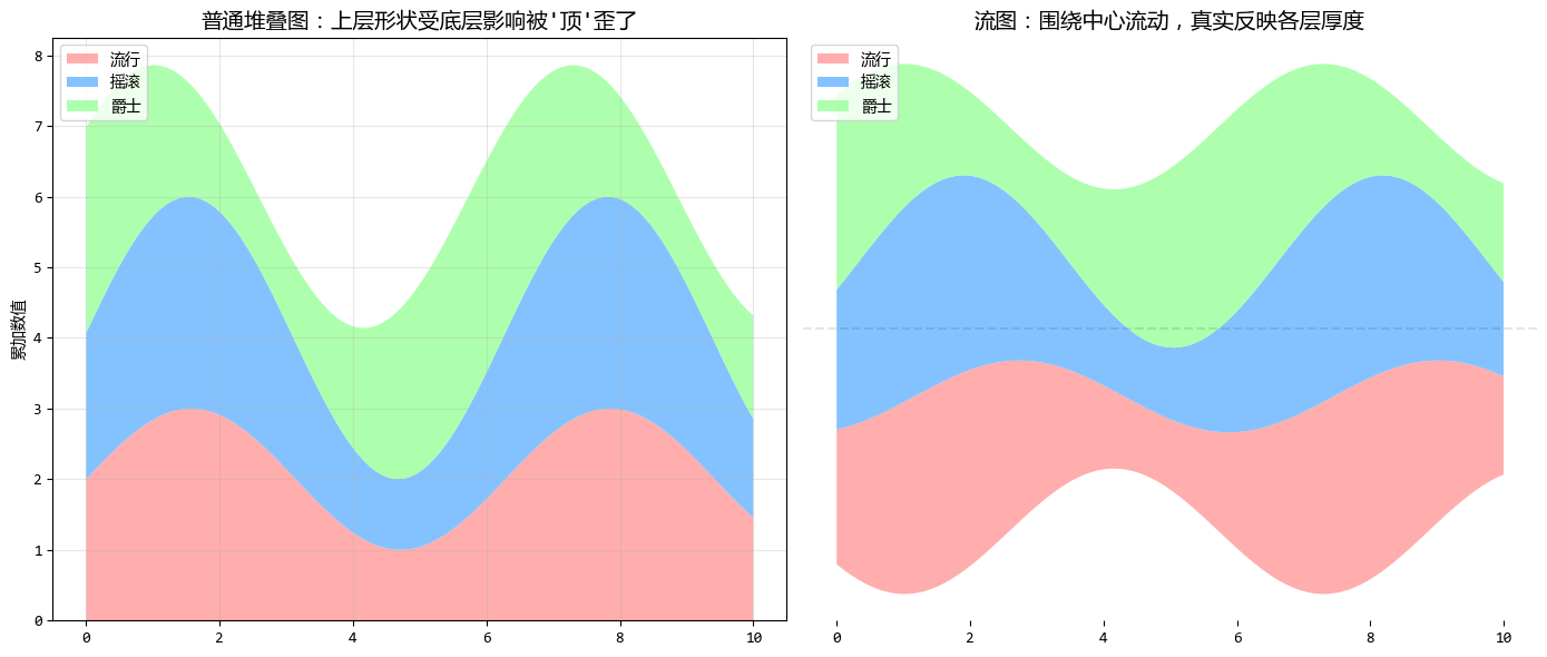 - # --- 左图:普通堆叠面积图 (baseline='zero') ---