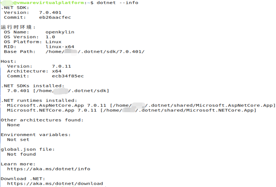 需要注意的是,openKylin建立的登录账户不具备root权限,所以在安装完成后需要配置以下环境变量,否则运行dotnet时会提示没有这个命令提示。