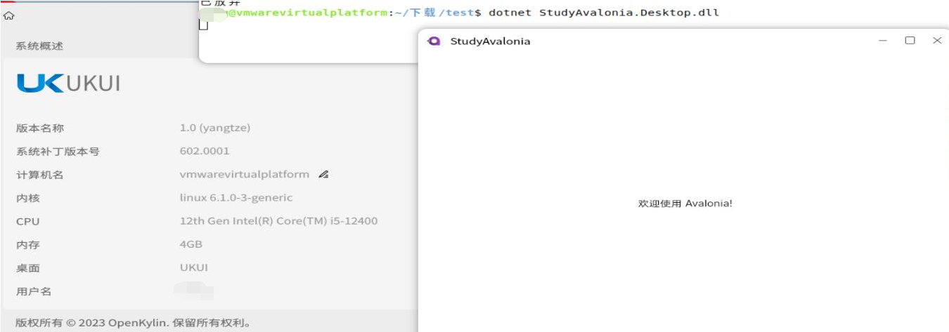 发布成功后,我们把项目复制粘贴到openKylin的环境下,然后在终端中定位到项目目录,运行- dotnet StudyAvalonia.Desktop.dll