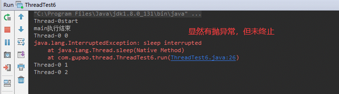 从上述结果可以看出,线程在吸收到停止指令之后,立刻停止了线程,相比于上一种自界说停止标识符的方法来说,它能更及时的相应停止线程指令。
