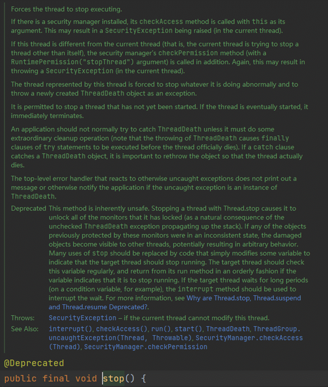 stop 方法是被 @Deprecated 修饰的不发起利用的逾期方法,而且在解释的第一句话就分析确 stop 方法为非安全的方法。