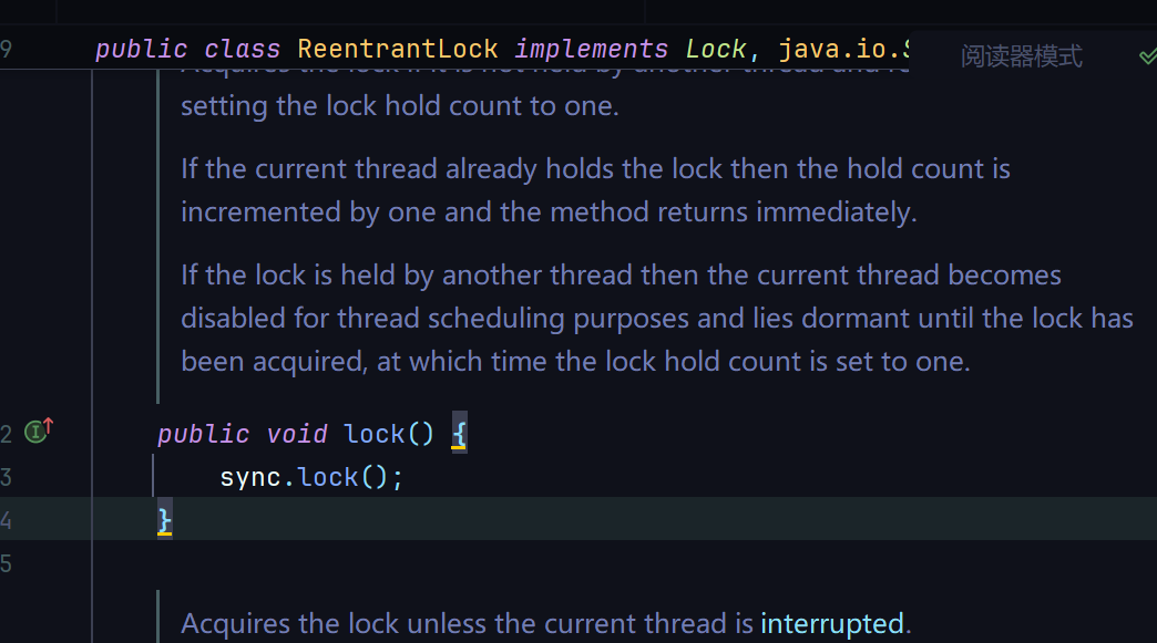 会进入sync的lock方法,此中Sync是ReentrantLock的一个内部类,ReentrantLock构造方法会默认使用非公平锁NonfairSync,这个类是继续于Sync的- final void lock() {