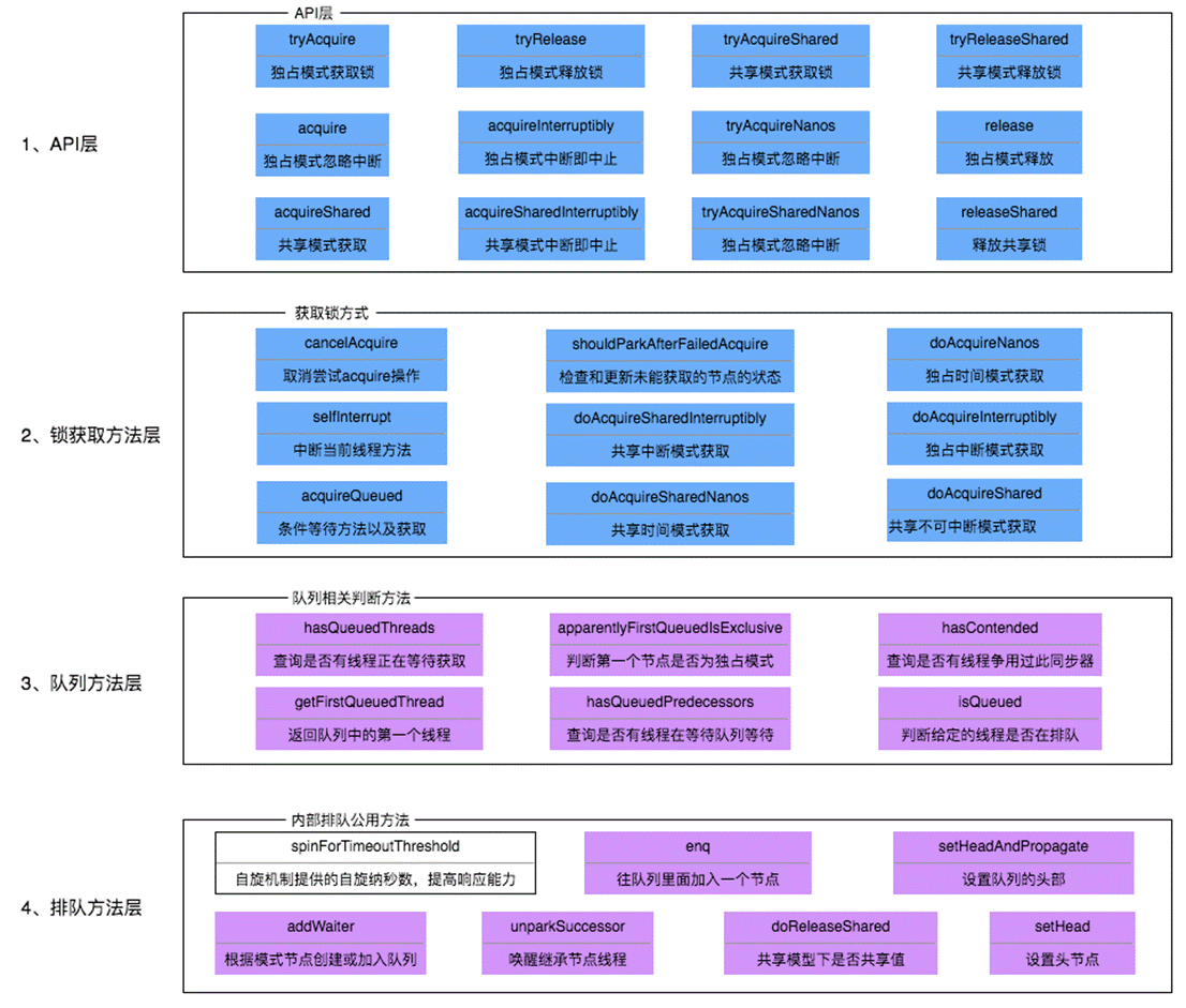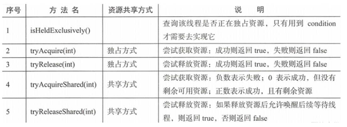 AQS只是一个框架 ,只界说了一个接口,详细资源的获取、开释都由自界说同步器去实现。差别的自界说同步器争用共享资源的方式也差别,自界说同步器在实现时只需实现共享资源state的获取与开释方式即可,至于详细线程等待队列的维护,如获取资源失败入队、叫醒出队等, AQS 已经在顶层实现好(就是模板方法模式),不须要详细的同步器再做处置惩罚。自界说同步器实现时告急实现以下几种方法: