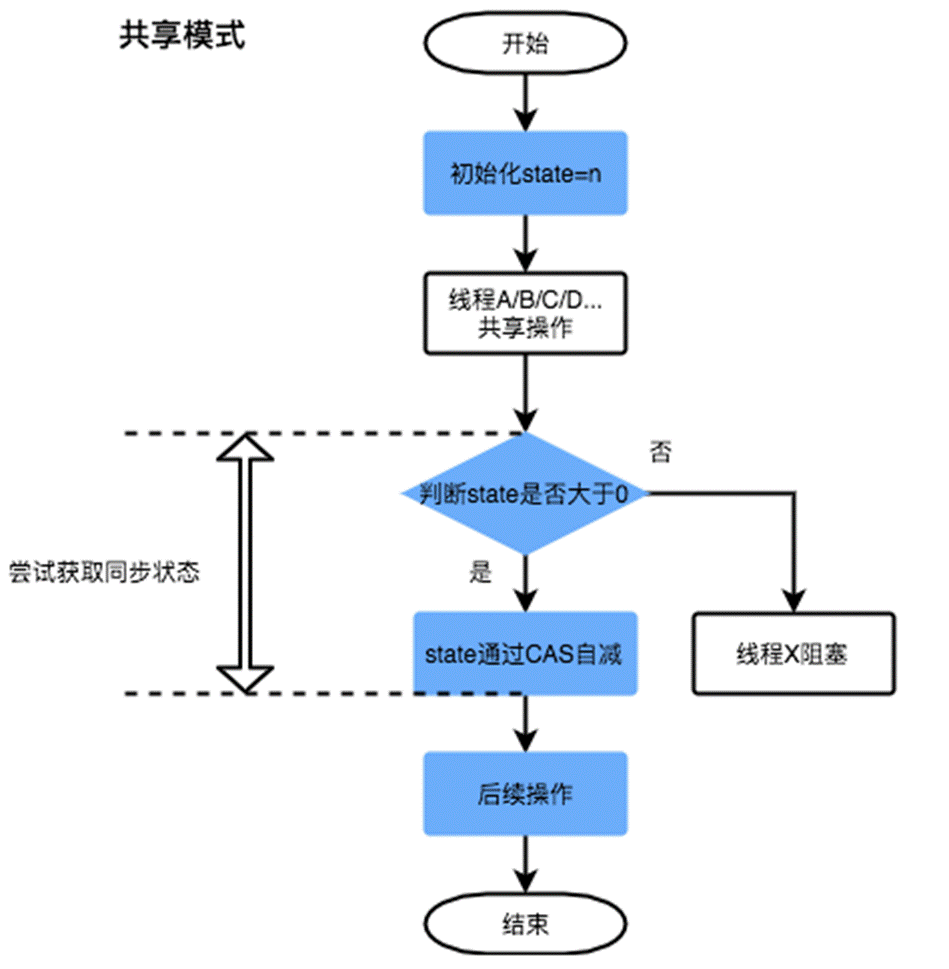 - 共享式:多个线程可同时实行,详细的 Java 实现有 Semaphore和CountDownLatch。
