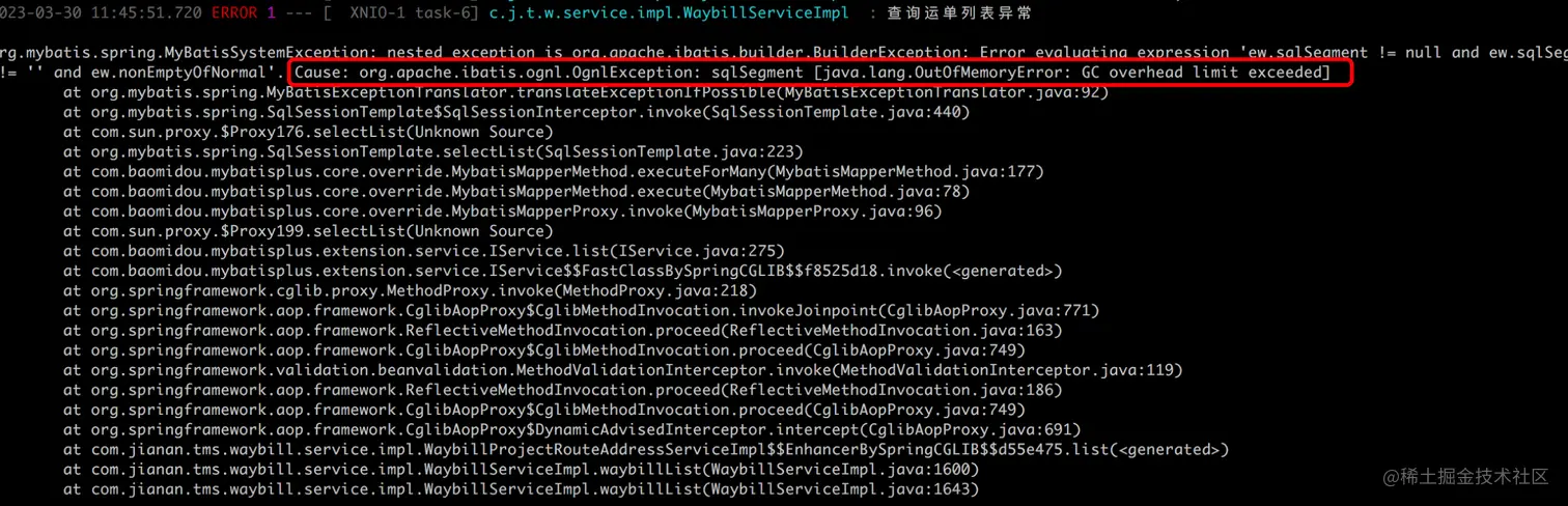 来看,这边属于Mybatis报出的一个内存溢出情况,通过去看Mybatis源码发现,底层也是通过一些集合类来存放拼接的sql,那么当然也有可能出现堆内存溢出,而且在sql体积比较大的情况下,接收sql的集合就会变的非常大,如果回收不了那么就会导致内存溢出。