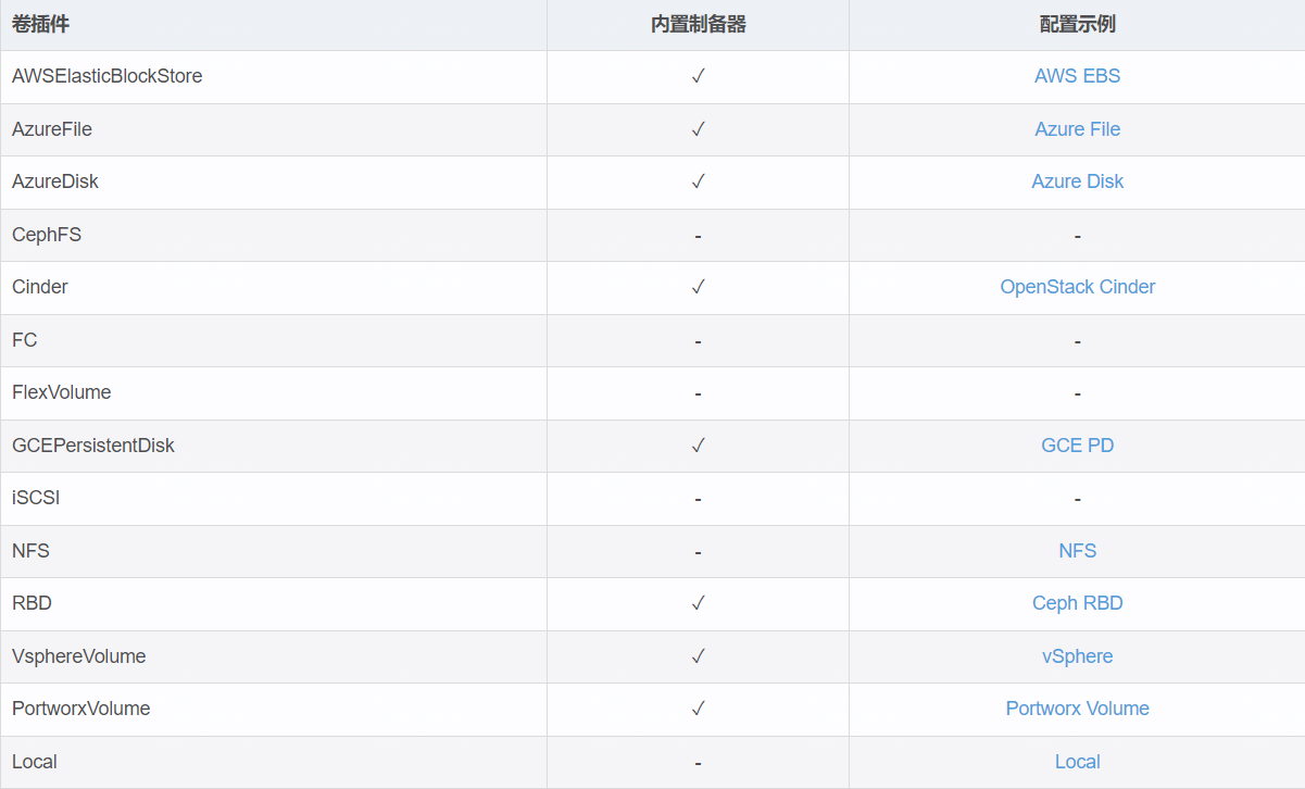 每个 StorageClass 都有一个供应商(Provisioner),用来决定使用哪个卷插件制备 PV。 该字段必须指定,官网提供供应商如下表:
