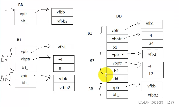 虚继承,里面就会有vbptr这个指针,因为虚继承是为了解决菱形继承中变量的二义性,使派生类中只有一份基类的成员变量,所以需要这个vbptr来记录里面的两个偏移量。
