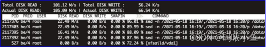 基于此可以推测是有进程在频繁的读取文件导致,监视磁盘I/O使用状况(iotop -oP),开释页面缓存后有几个sed下令读取文件进程占用IO很高。