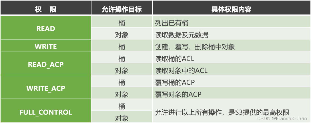 访问控制列表是S3提供的可供用户自行定义的访问控制策略列表。S3的访问控制策略(ACP)提供如下所列的五种访问权限。