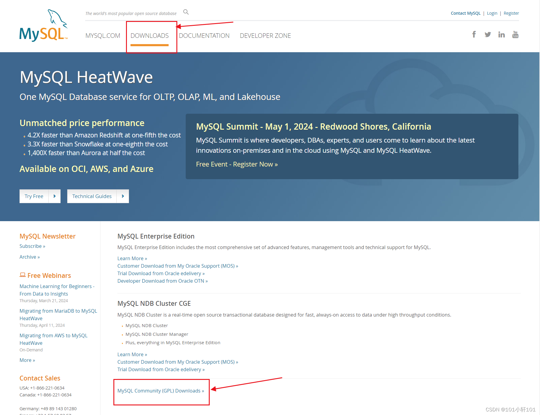 **步调一:**进入MySQL官网,依次点击“DOWNLOADS→MySQL Community (GPL) Downloads »"进入下载页。