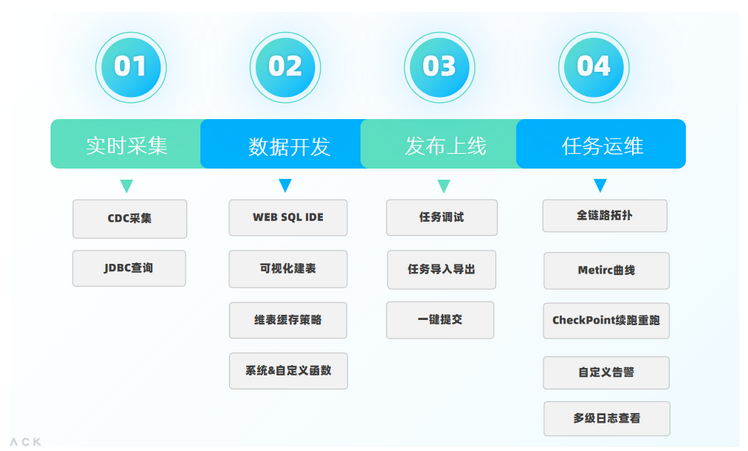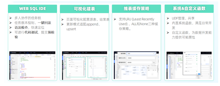 ,包括:WEB SQL IDE、可视化建表、维表缓存策略及系统&自定义函数,丰富的底层组件封装,界面化操作,降低开发门槛,使开发人员专注于业务逻辑处理。