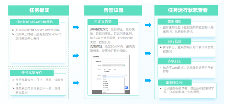 内含实时开发全链路工具,采集、计算、运维一体,降低客户使用成本,降低实时计算门槛。