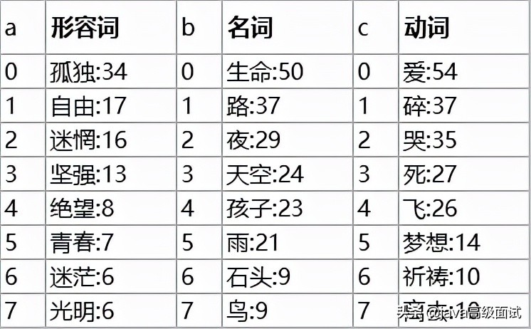 有一位网友统计了知名歌手在大陆发行的 9 张专辑中 117 首歌曲的歌词,同一词语在一首歌出现只算一次,形容词、名词和动词的前十名如下表所示(词语反面的数字是出现的次数):