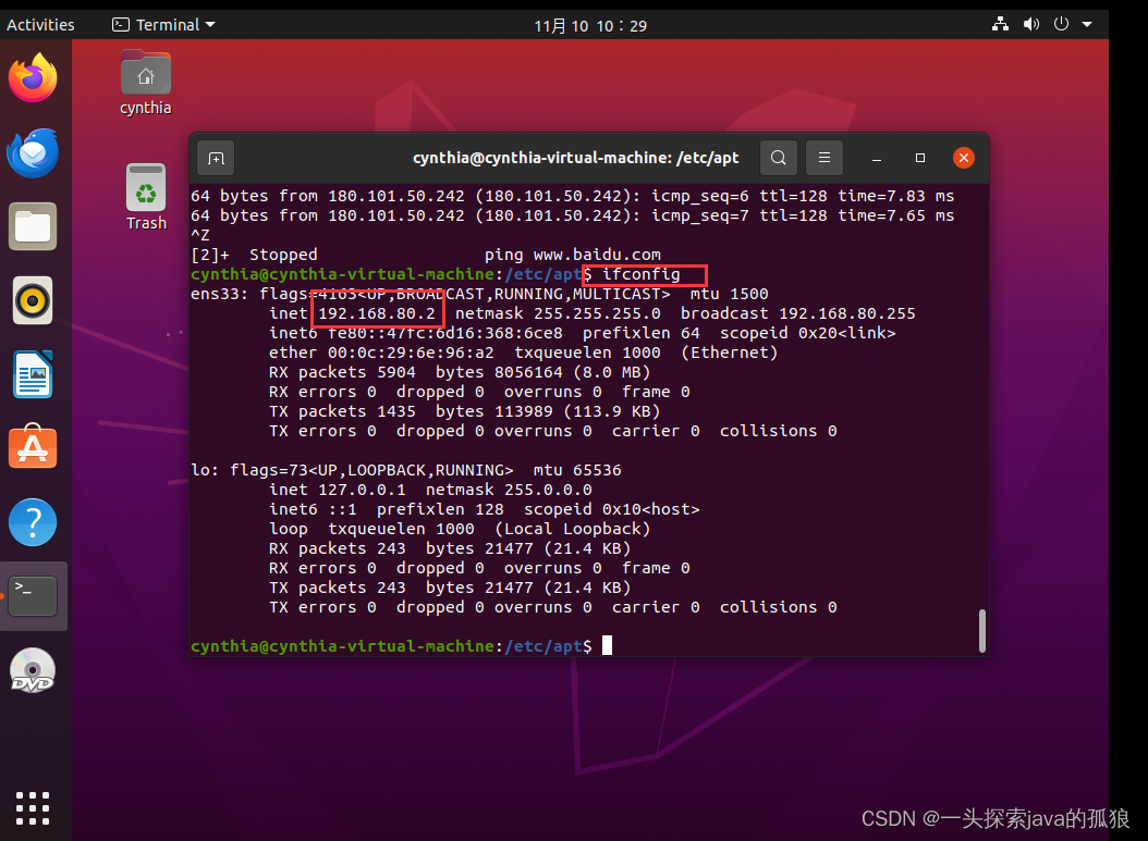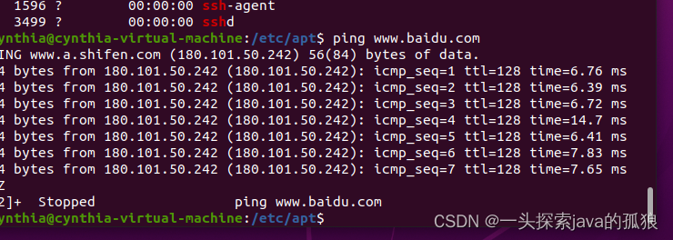 ping www.baidu.com,看一下虚拟机是否可以联网。如果能够ping通说明虚拟机可以联网,配置没有题目。 ping