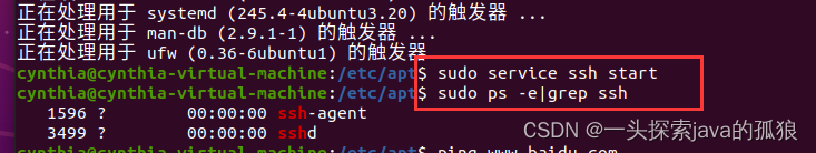 第六步:输入sudo service ssh start开启ssh,输入以下下令检察ssh是否 ps -e | grep ssh启动
