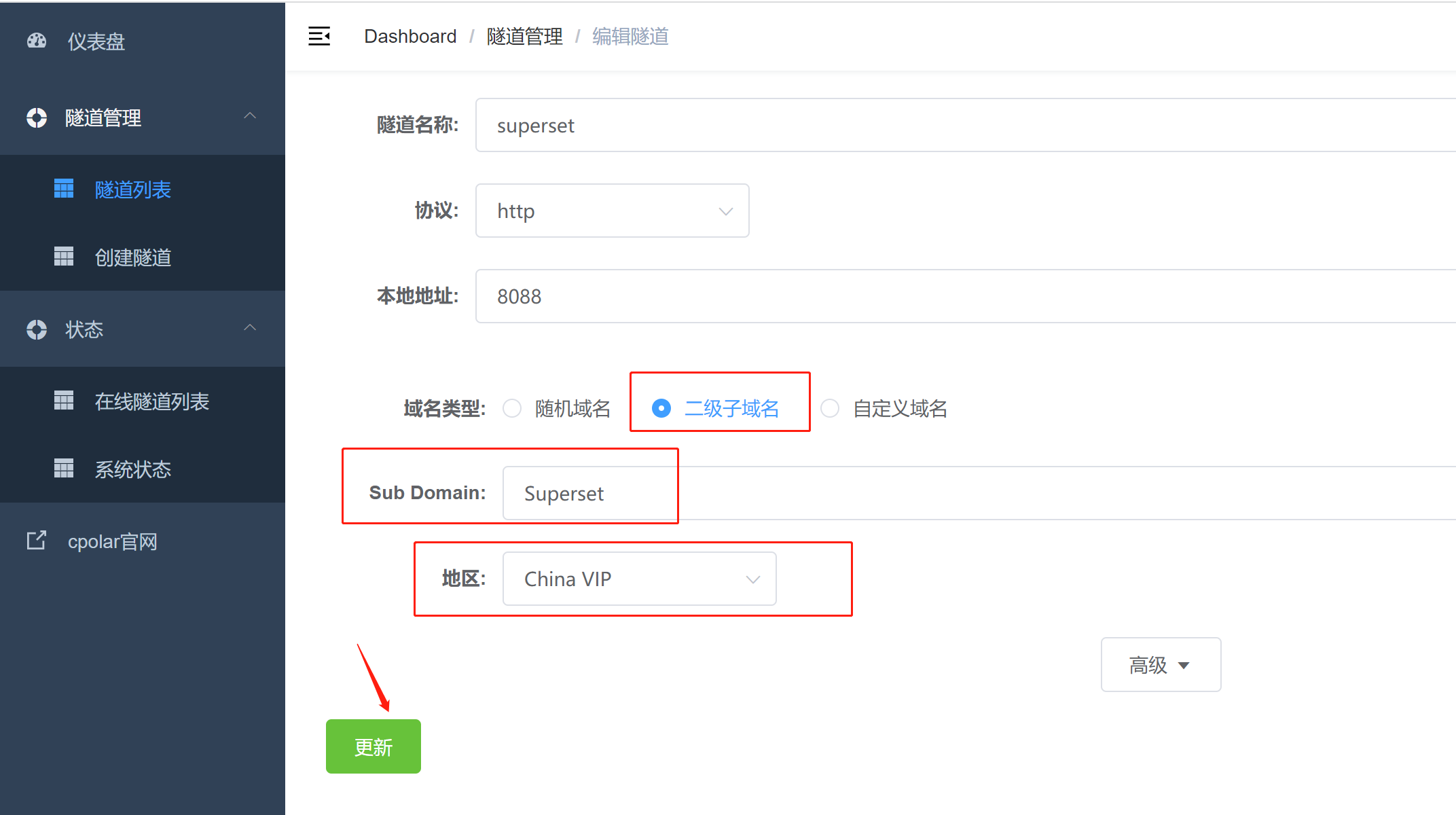修改隧道信息,将生存乐成的二级子域名配置到隧道中