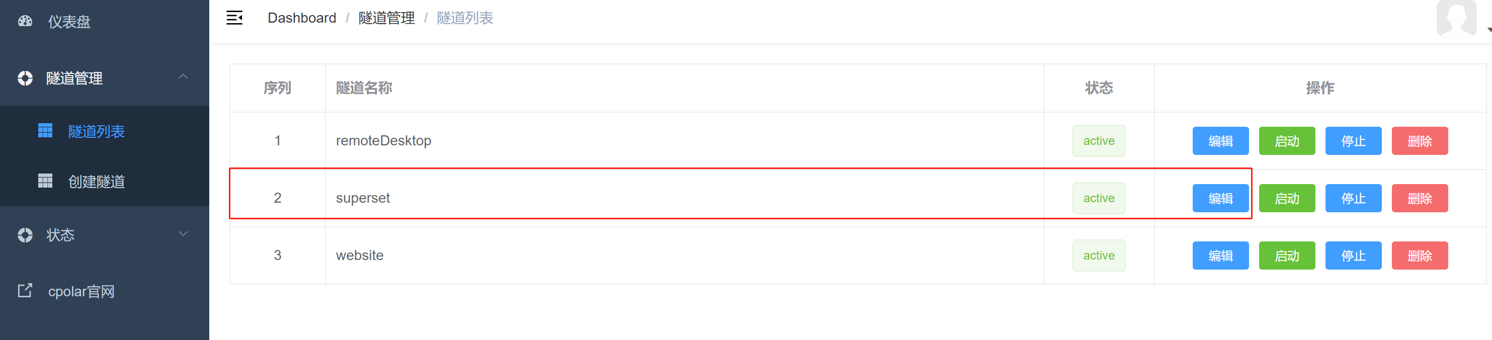 数据隧道创建完成后,cpolar会自动跳转至隧道管理——隧道列表页面。在这个页面,我们可以对这条数据隧道进行管理,包括开启、关闭或删除这条隧道,也可以点击编辑按钮,对这条数据隧道的信息进行修改。