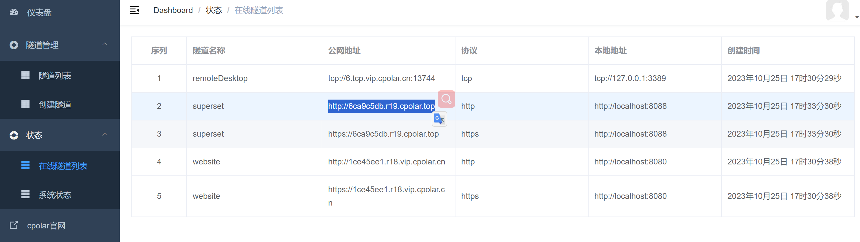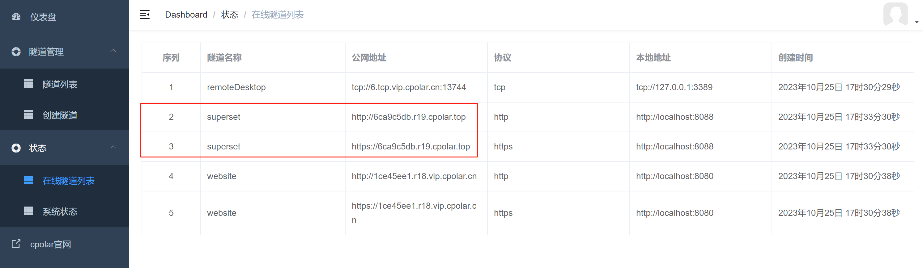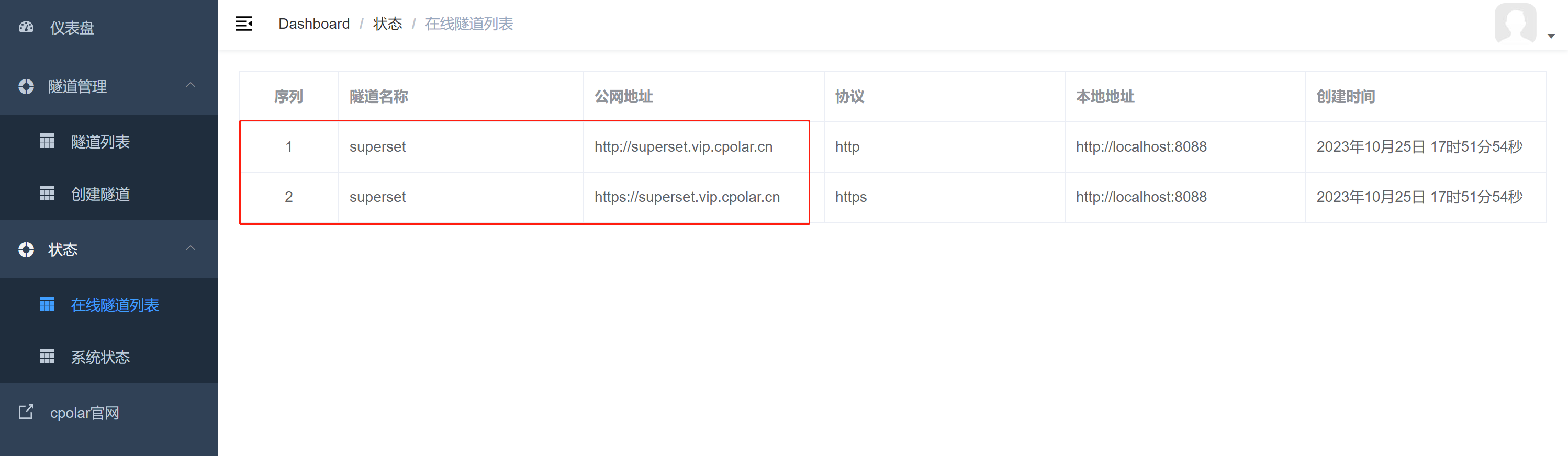 superset数据隧道入口(公共互联网访问所在),则可以在状态——在线隧道列表中找到。