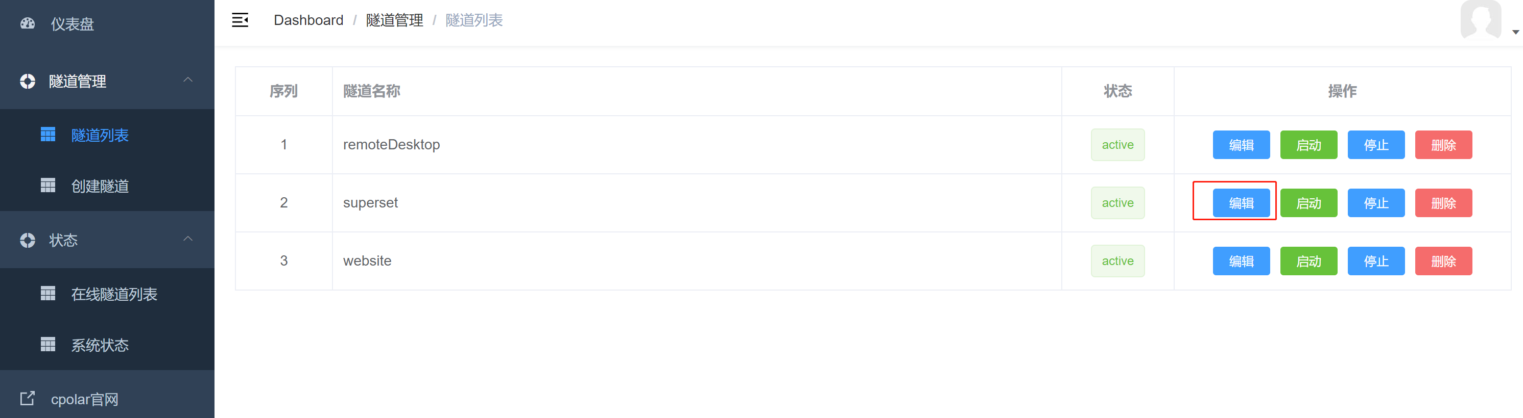 返回登录cpolar web UI管理界面,点击左侧仪表盘的隧道管理——隧道列表,找到所要配置的隧道,点击右侧的编辑