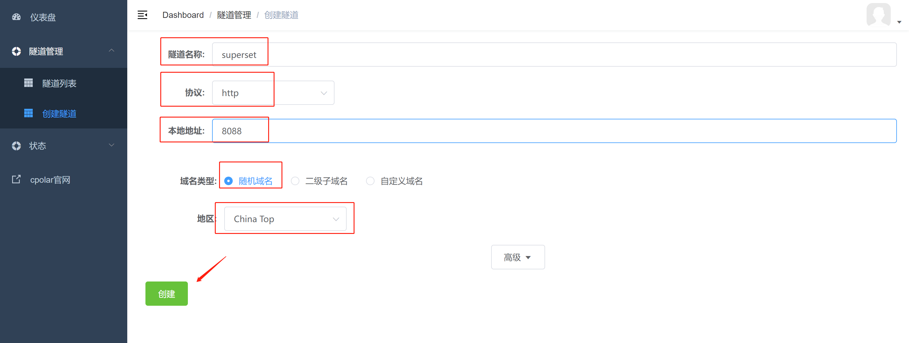 - 域名类型:假如打算创建暂时数据隧道,则直接勾选“随机域名”,由cpolar客户端自行生成网络所在