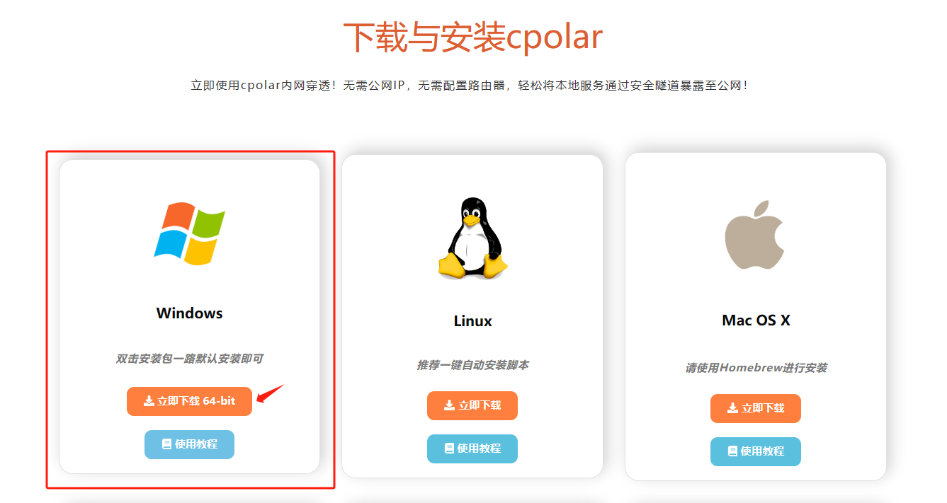 在cpolar的下载页面中,找到对应版本的cpolar安装程序,笔者使用的是Windows利用系统,因此选择Windows版下载。