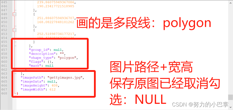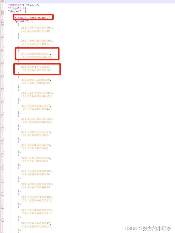 这个shapes很重要,内里有我们自己画的标签的类别,比如“chaiquan1”和我们当时画标签的时候,描的每一个点。