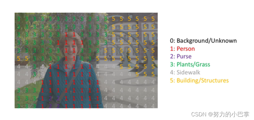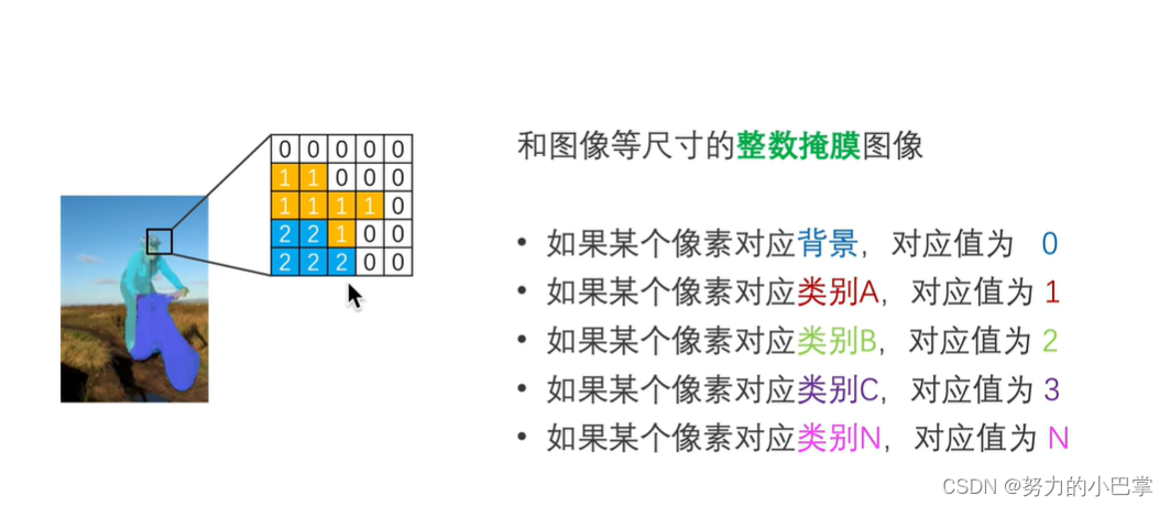 语义分割的本质,就是给每个像素做分类,所以,语义分割的标注,就是给每个像素打上类别标签,这种格式,叫做整数掩膜格式,由于能够严丝合缝的盖在原来的图上,所以,叫做掩码: