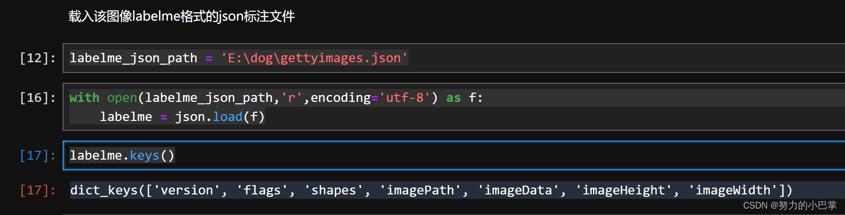 - `labelme = json.load(f)`: 这一利用用了Python的内置`json`模块来从已经打开的文件对象`f`中读取数据,并将其解析为Python的数据结构(通常是字典或列表)。这意味着如果LabelMe的JSON文件中包罗图像的标签、边界框、多边形等标注信息,这些信息会被转换成Python的数据范例,存储在变量`labelme`中,供后续的程序逻辑使用。