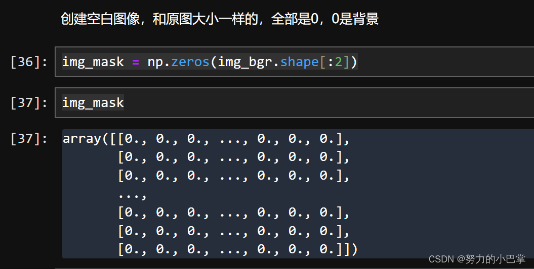 这段代码创建了一个与`img_bgr`图像具有相同宽度和高度的二维numpy数组`img_mask`,并且这个数组的所有元素都被初始化为0。这里是逐步解析: