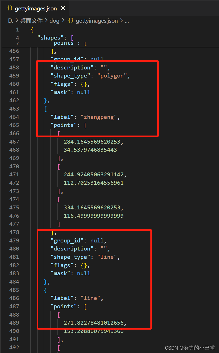 比如,第一个是“chaiquan”标签的信息;那第二个就是“zhangpeng”的标签信息;以此类推,一张图片上,你打了几个标签,就会在json文件里出现几个标签的信息