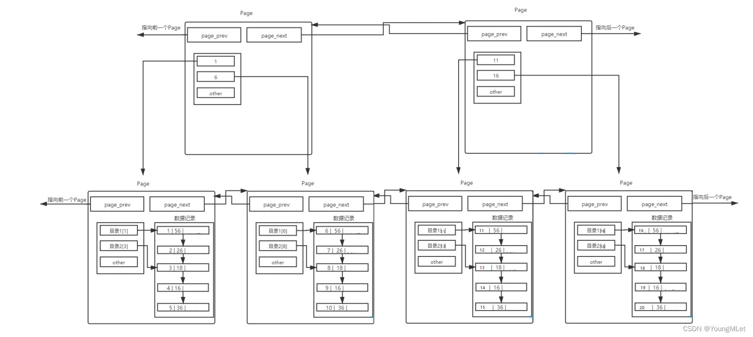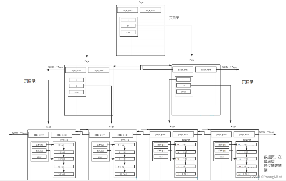 存在一个目录页来管理页目录,目录页中的数据存放的就是指向的那一页中最小的数据。有数据,就可通过比较,找到该访问谁人 Page,进而通过指针,找到下一个 Page。