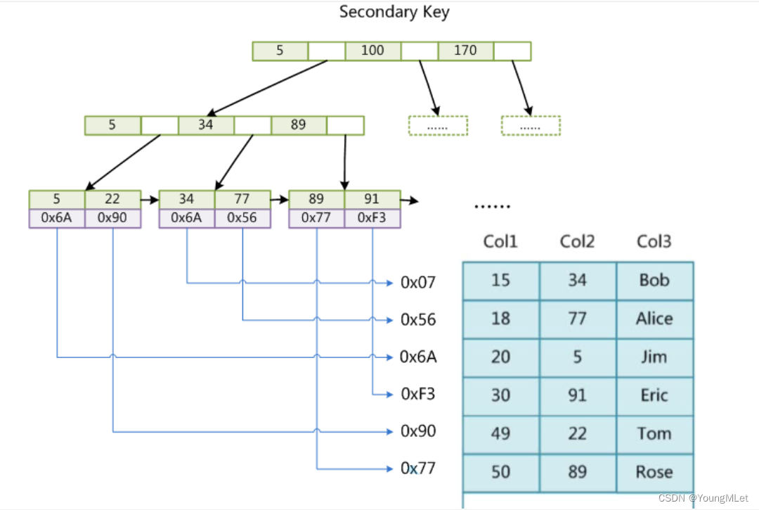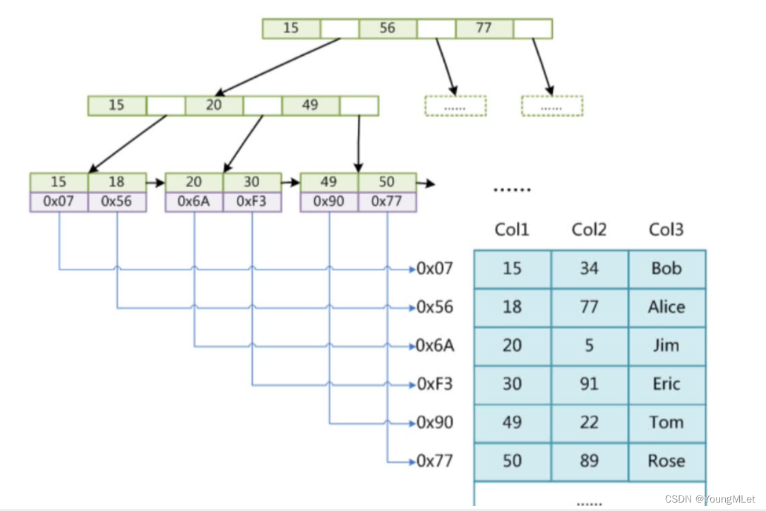 下面我们简单介绍一下 MyISAM 存储引擎-主键索引。MyISAM 引擎同样使用 B+ 树作为索引效果,叶节点的 data 域存放的是数据记录的地址。下图为 MyISAM 表的主索引, Col1 为主键:
