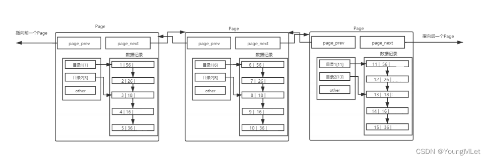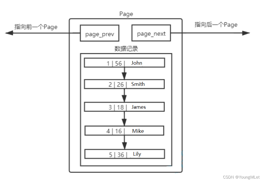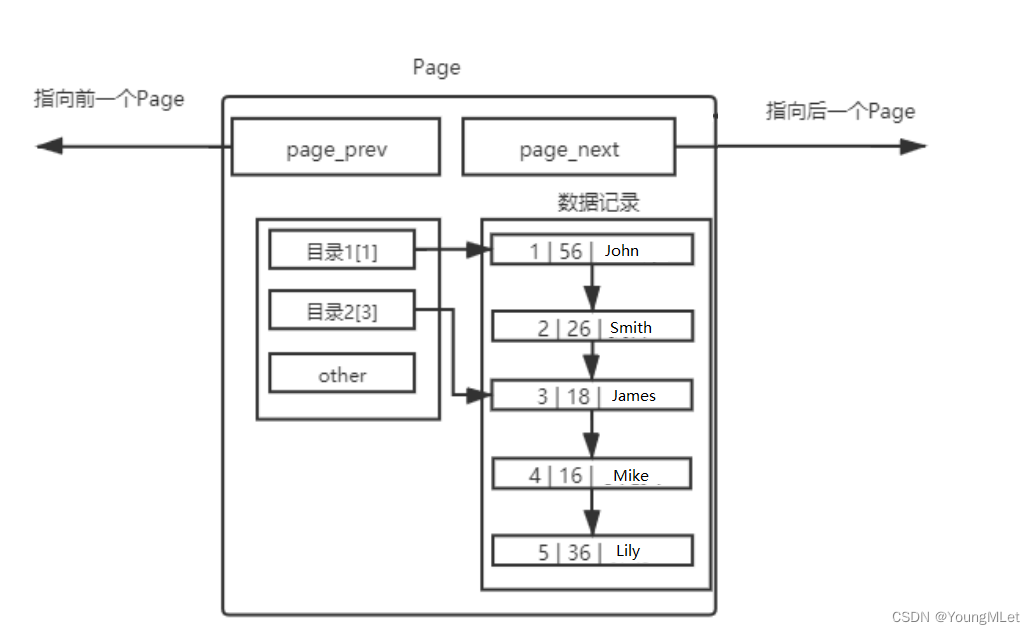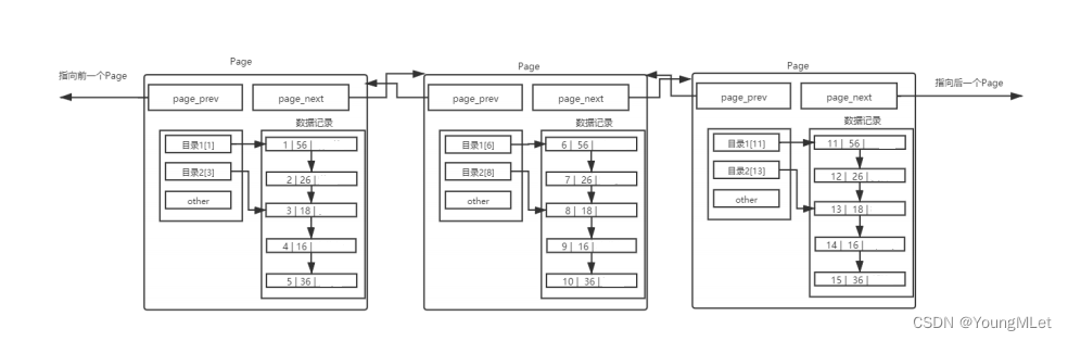 不同的 Page ,在 MySQL 中,都是 16KB ,使用 prev 和 next 构成双向链表。因为有主键的问题, MySQL 会默认按照主键给我们的数据举行排序,从上面的 Page 内数据记录可以看出,数据是有序且彼此关联的。