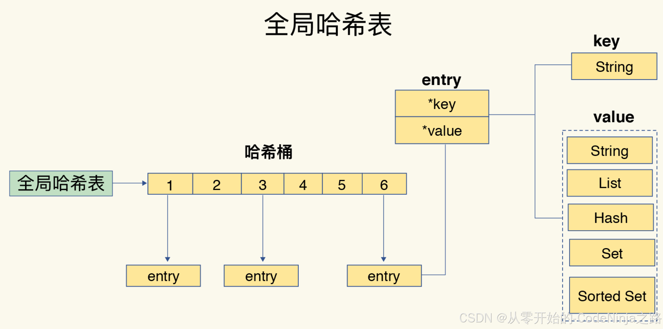 Redis 使用哈希表来生存所有键值对,实现从键到值的快速访问。哈希表就是一个数组,每个元素称为一个哈希桶,哈希桶中的元素生存的并不是值本身,而是指向具体值的指针。哈希表生存了所有的键值对,也称为全局哈希表,时间复杂度为O(1)