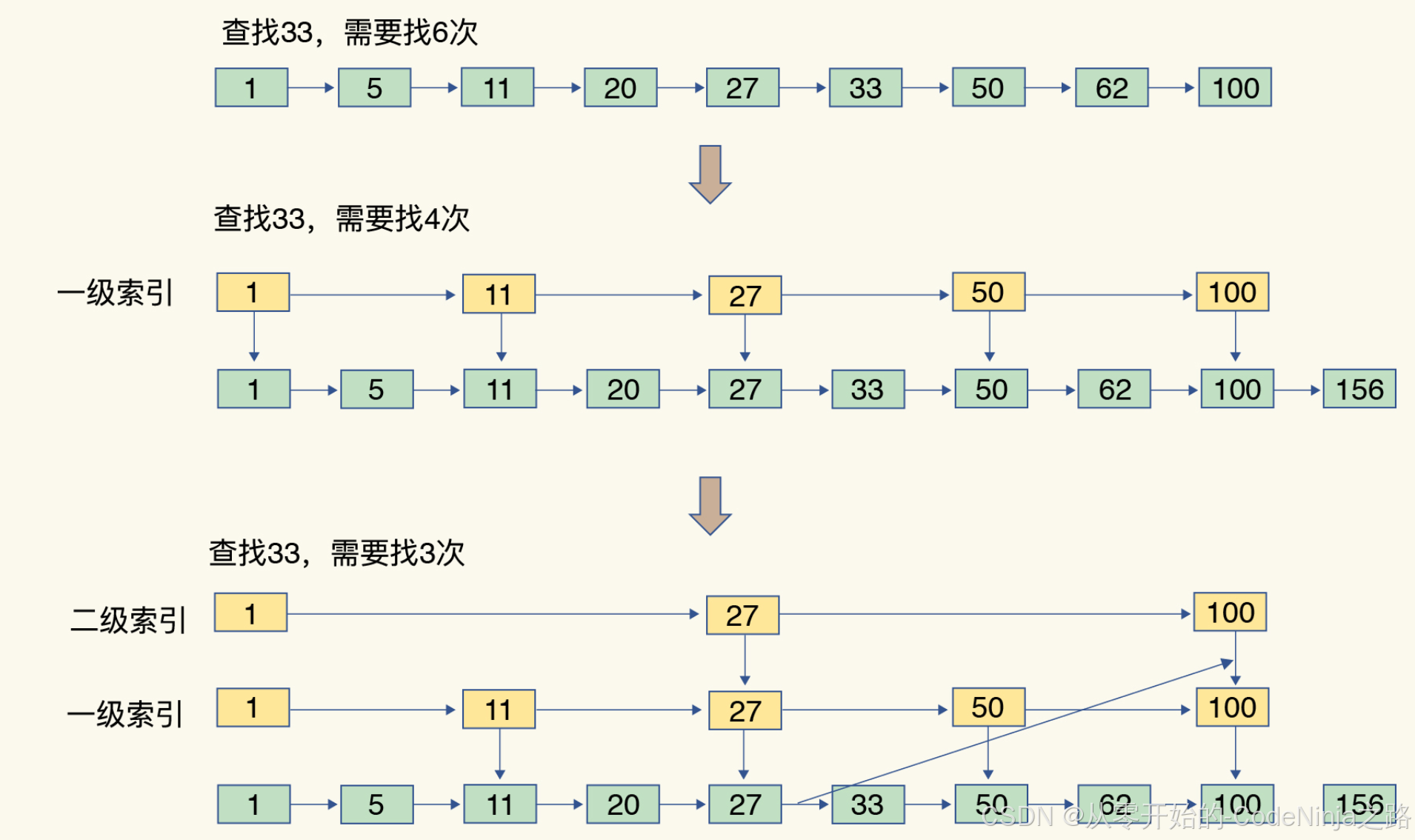 跳表在链表的基础上,增长了多级索引,通过索引位置的几个跳转,实现数据的快速定位,当数据量很大时,跳表的查找复杂度就是 O(logN)
