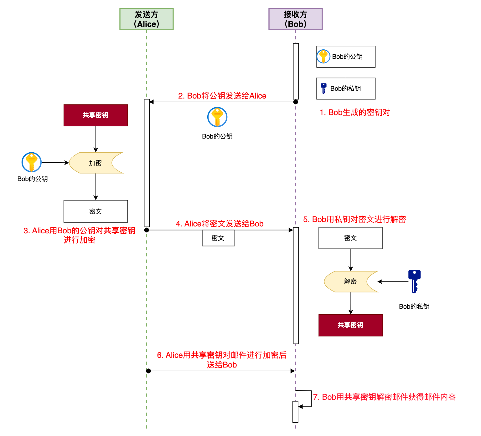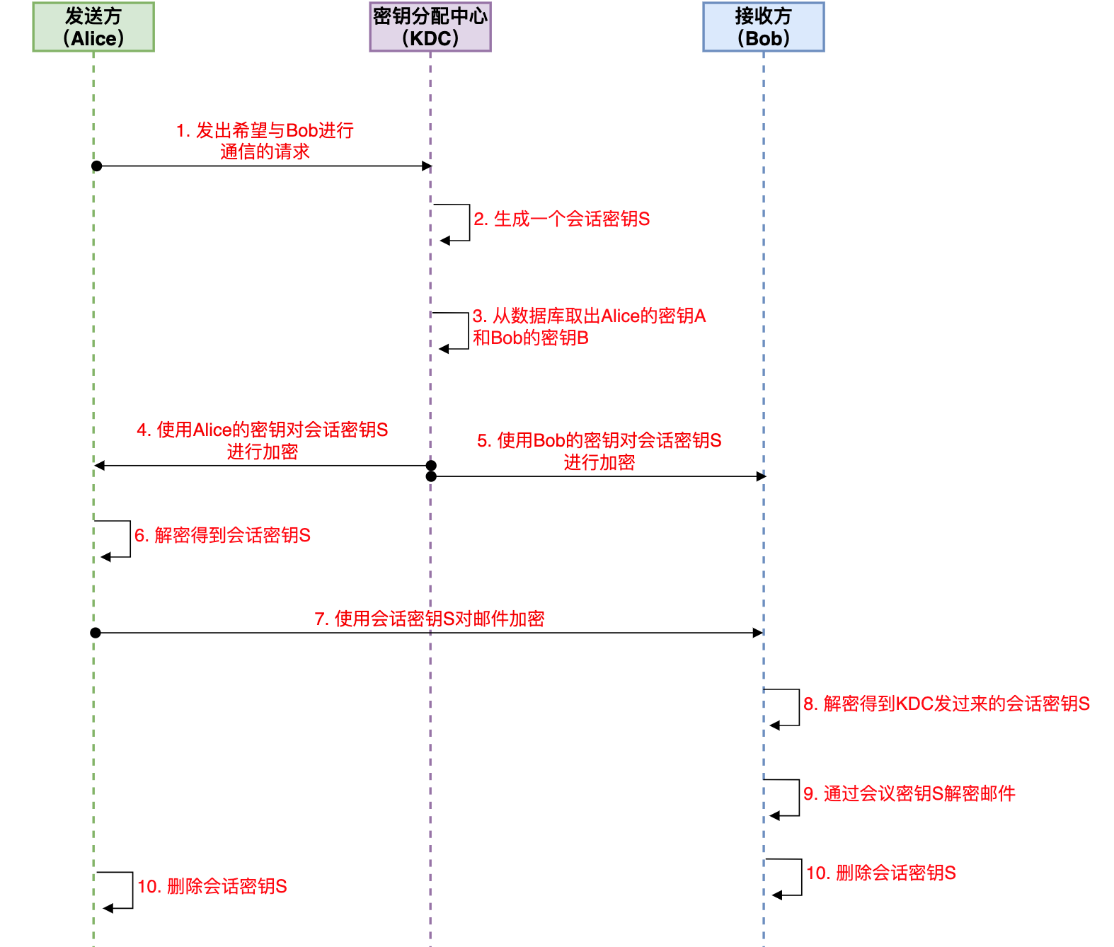 有了KDC后,Alice向Bob发送加密邮件时,具体的步骤如下: