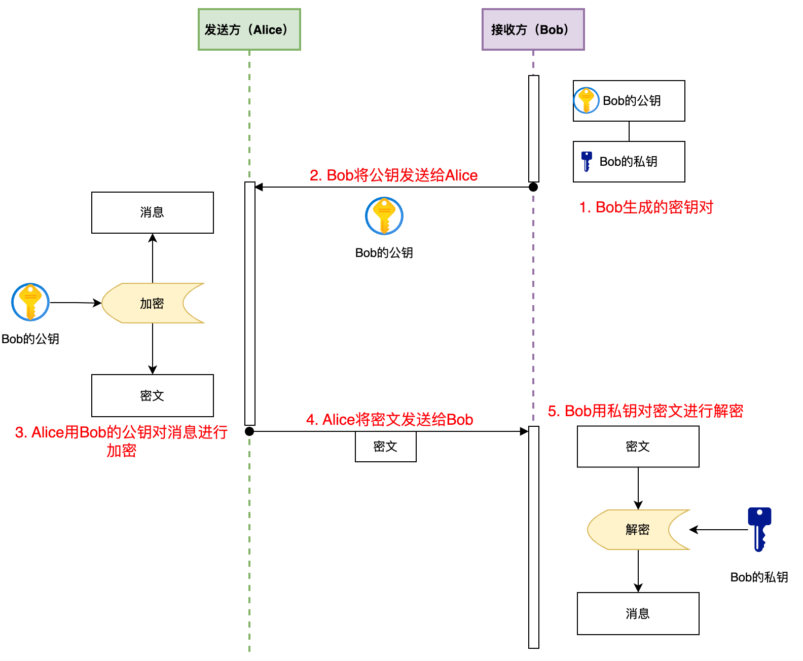 上图为在KDC的到场下,Alice与Bob的加密通讯过程。