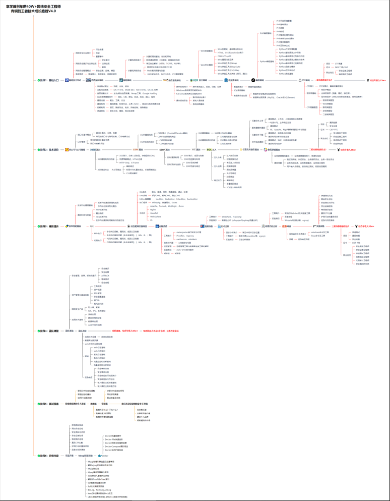 我一共划分了六个阶段,但并不是说你得学完全部才气上手工作,对于一些低级岗位,学到第三四个阶段就足矣~