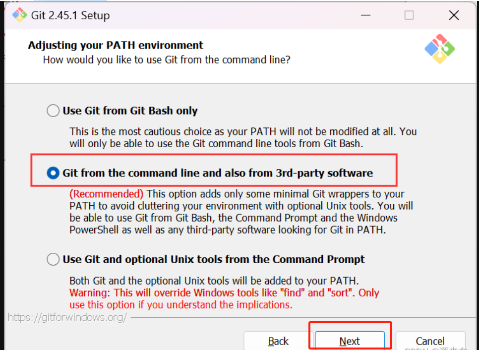 - 第三个是 “从命令提示符使用Git和可选的Unix工具” 。警告:这将覆盖Windows工具,如“find 和sort ”。只有在了解其含义后才使用此选项。