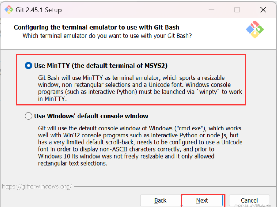 - 第一个是“使用MinTTY(MSYS2的默认终端)”。Git Bash将使用MinTTY作为终端模拟器,该模拟用具有可调整巨细的窗口,非矩形选择和Unicode字体。Windows控制台程序(比方交互Python)必须通过“ winpty”启动才气在MinTTY中运行。