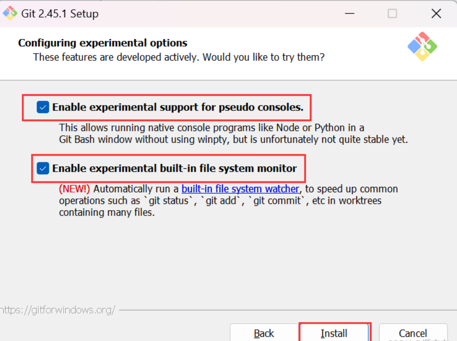 - 第二个,启用实验性内置文件系统监视器自动运行内置的文件系统监视程序,以加速包含许多文件的工作树中的常见操作,如“git status”、“git add”、“git commit”等,可以根据需要选择,这里都选上了。