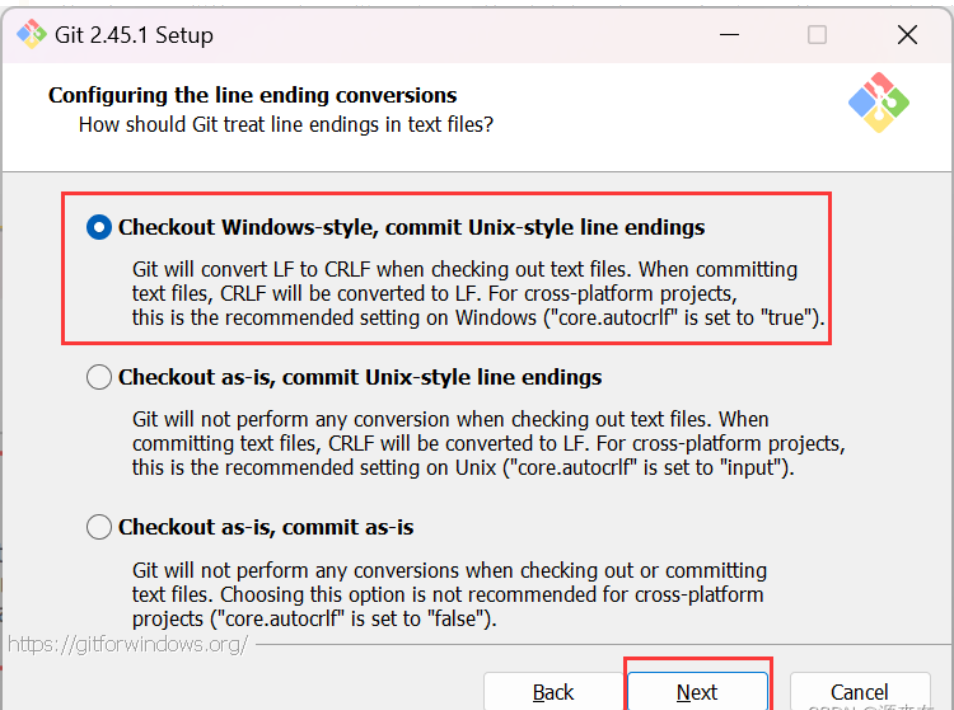 - 第一个是“签出Windows风格,提交Unix风格的行尾”。签出文本文件时,Git会将LF转换为 CRLF。提交文本文件时,CRLF将转换为LF。对于跨平台项目,这是Windows上的推荐设置(core.autocrlf”设置为“ true”)