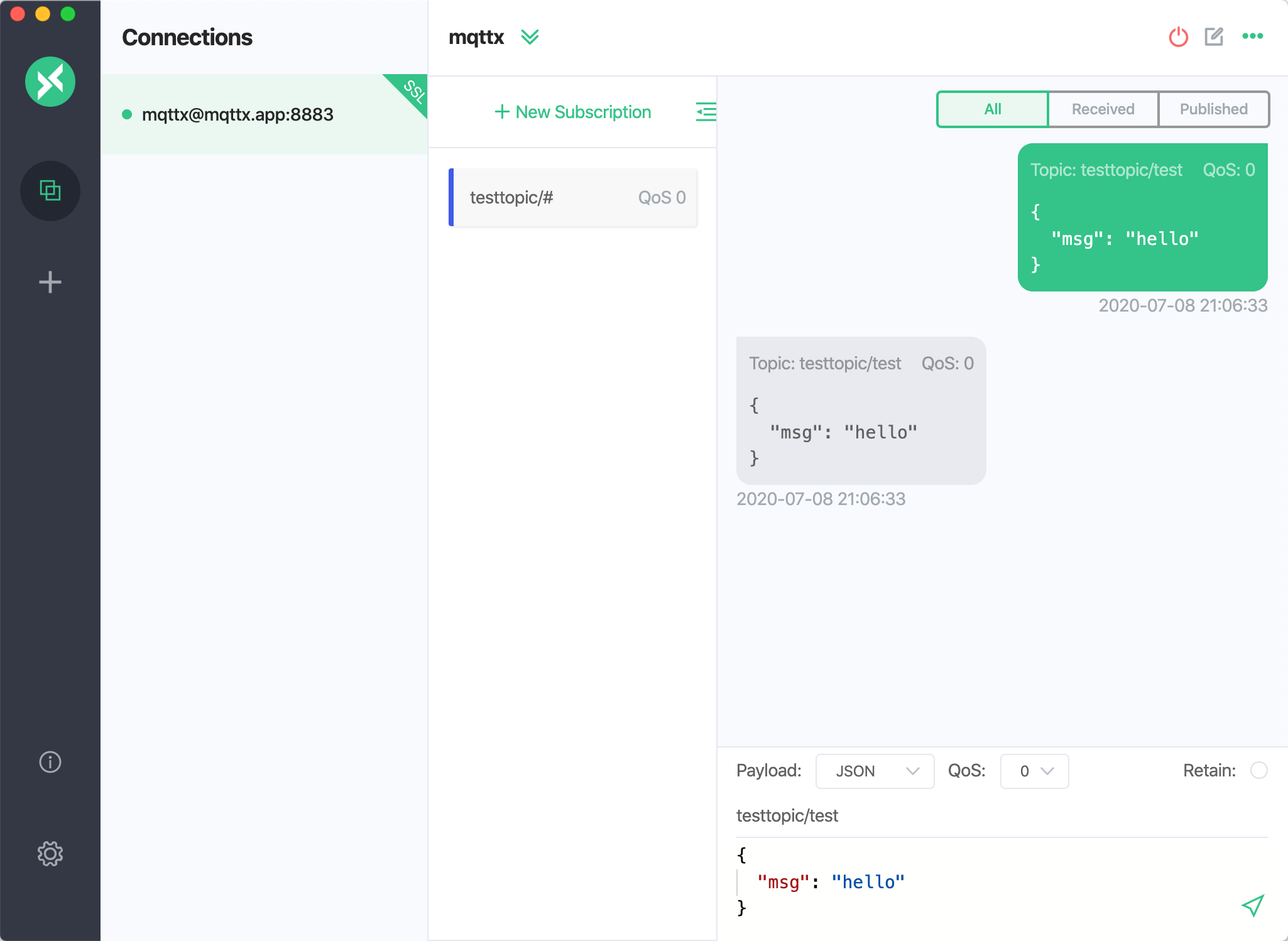 当配置完成并重启 EMQX 后,我们利用 MQTT 客户端工具 - MQTTX(该工具跨平台且支持 MQTT 5.0),来验证 TLS 服务是否正常运行。