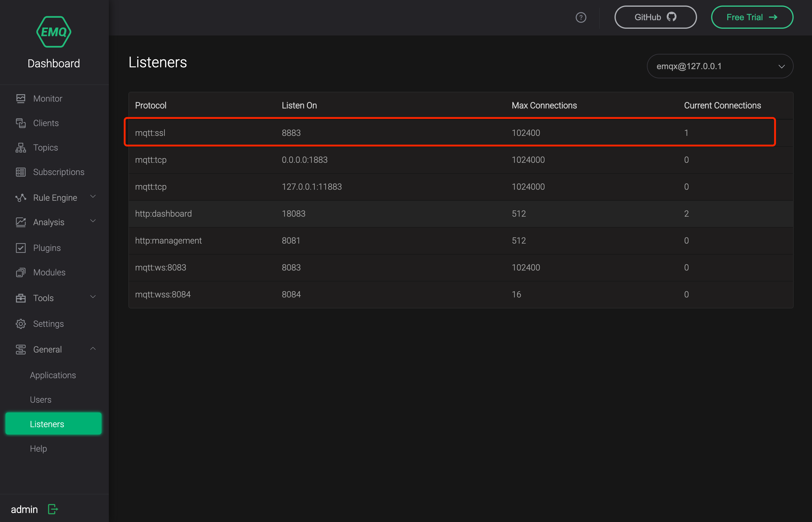 最后,打开 EMQX 的 Dashboard 在 Listeners 页面可以看到在 8883 端口上有一个 mqtt:ssl 连接。