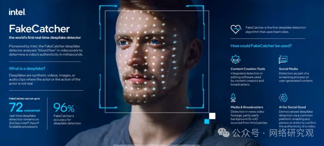 英特尔推出了一款名为 FakeCatcher 的实时深度伪造检测仪。