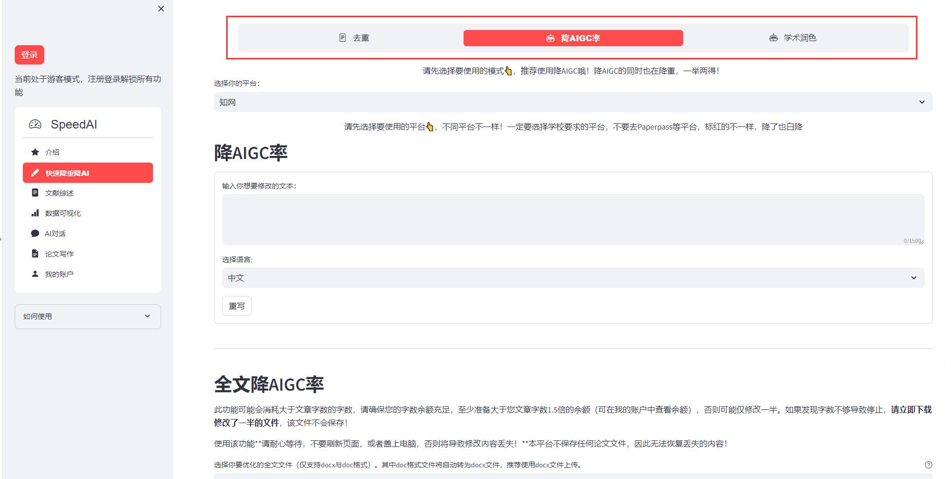 SpeedAI科研小助手是一个基于人工智能技术的科研助手,可以帮助您举行文献降重、降AIGC率、润色。克制重复劳动,提高科研效率。不过如今该网站只针对知网、维普、格子达平台的检测。