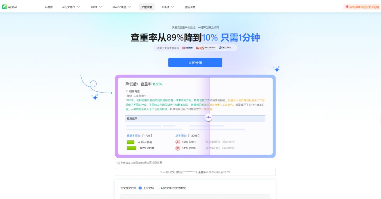 可以使文章查重率从89%降到10%,并且只需1分钟,操作简单易上手,只必要上传论文或粘贴文本,一键降至