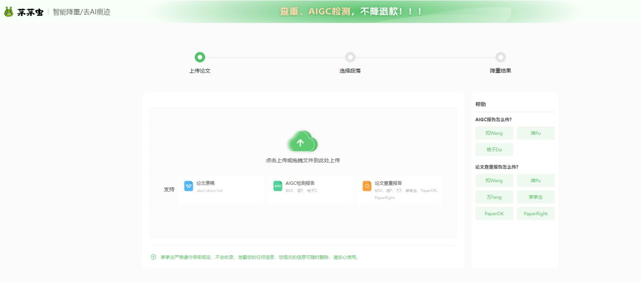 茅茅虫论文写作助手是一款集成了多种功能的AI论文辅助工具。它的核心功能之一就是降AIGC,即降低论文中AIGC的比例,以提高论文的原创性。我们只需上传